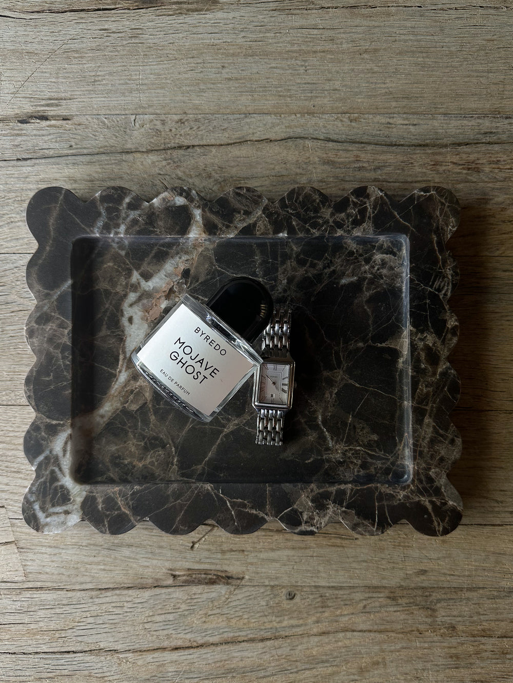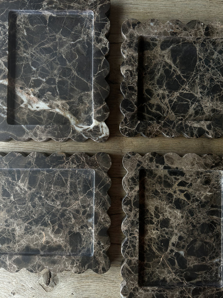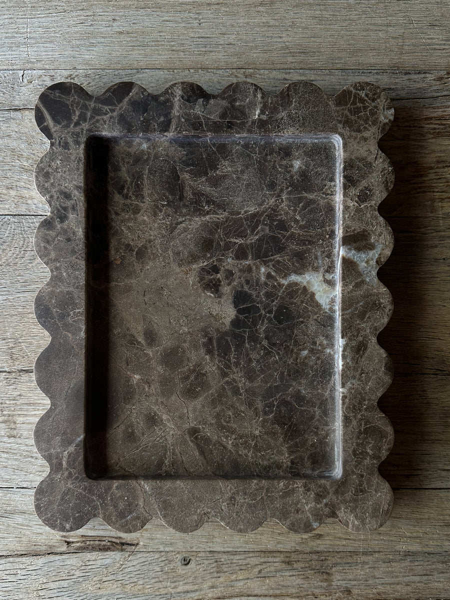 The Bivalvia Tray with its delicate scallop design features a beautiful brown toned marble with warm veining throughout. This tray acts as an art piece on its own atop a coffee table or dresser. Due to the nature of natural stone color variations are to be expected