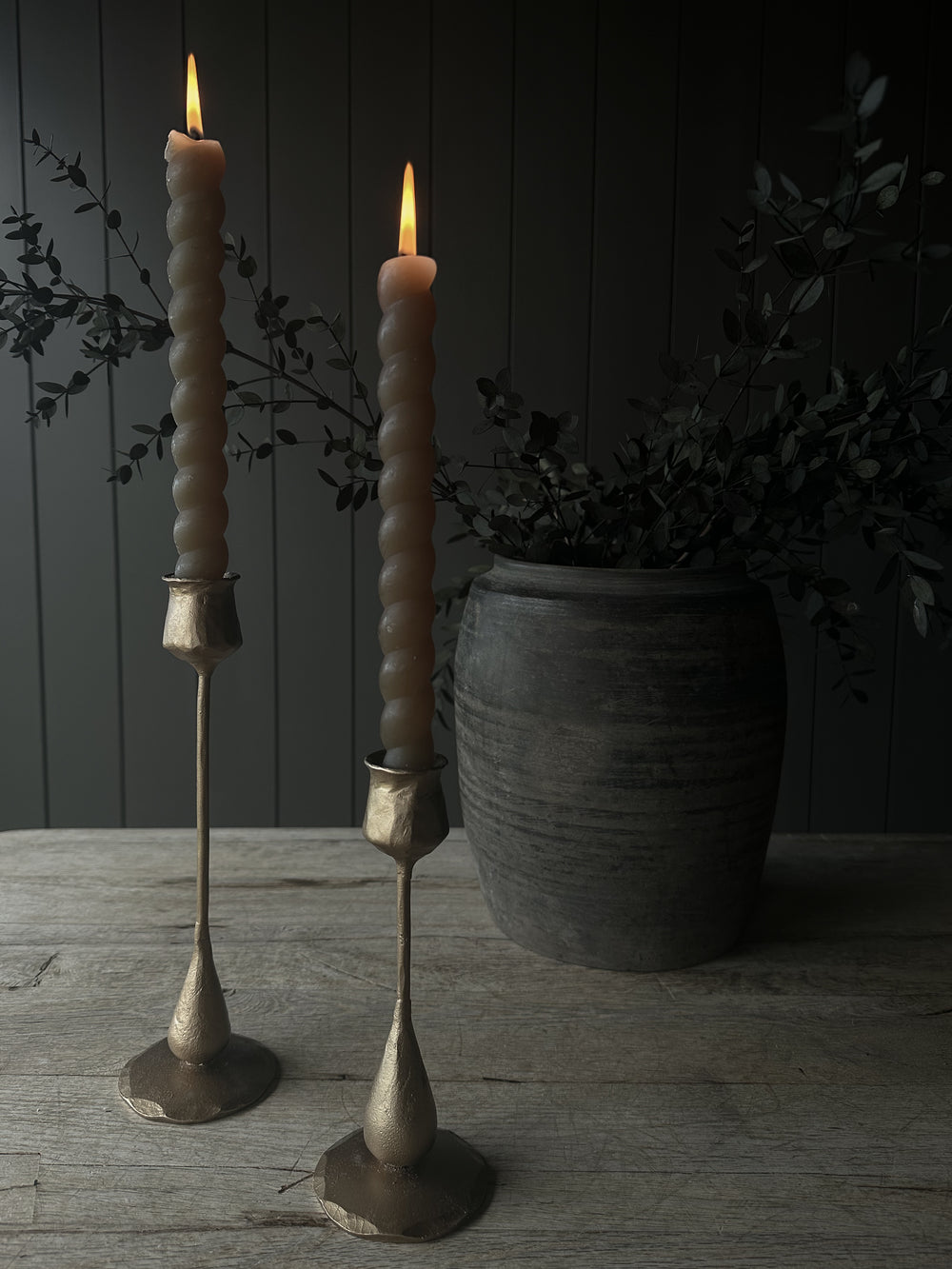 Two off set hand forged tulip shaped taper candle holders with a gold finish. Pair with your favorite taper candles to set a beautiful tone in your home.