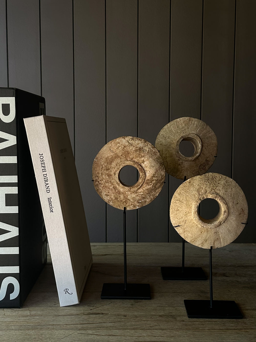 Imperfectly round with a cored center, the Small Millstone on Base comes as a set of three. Each millstone is distinctive, showing signs of its former mill use.