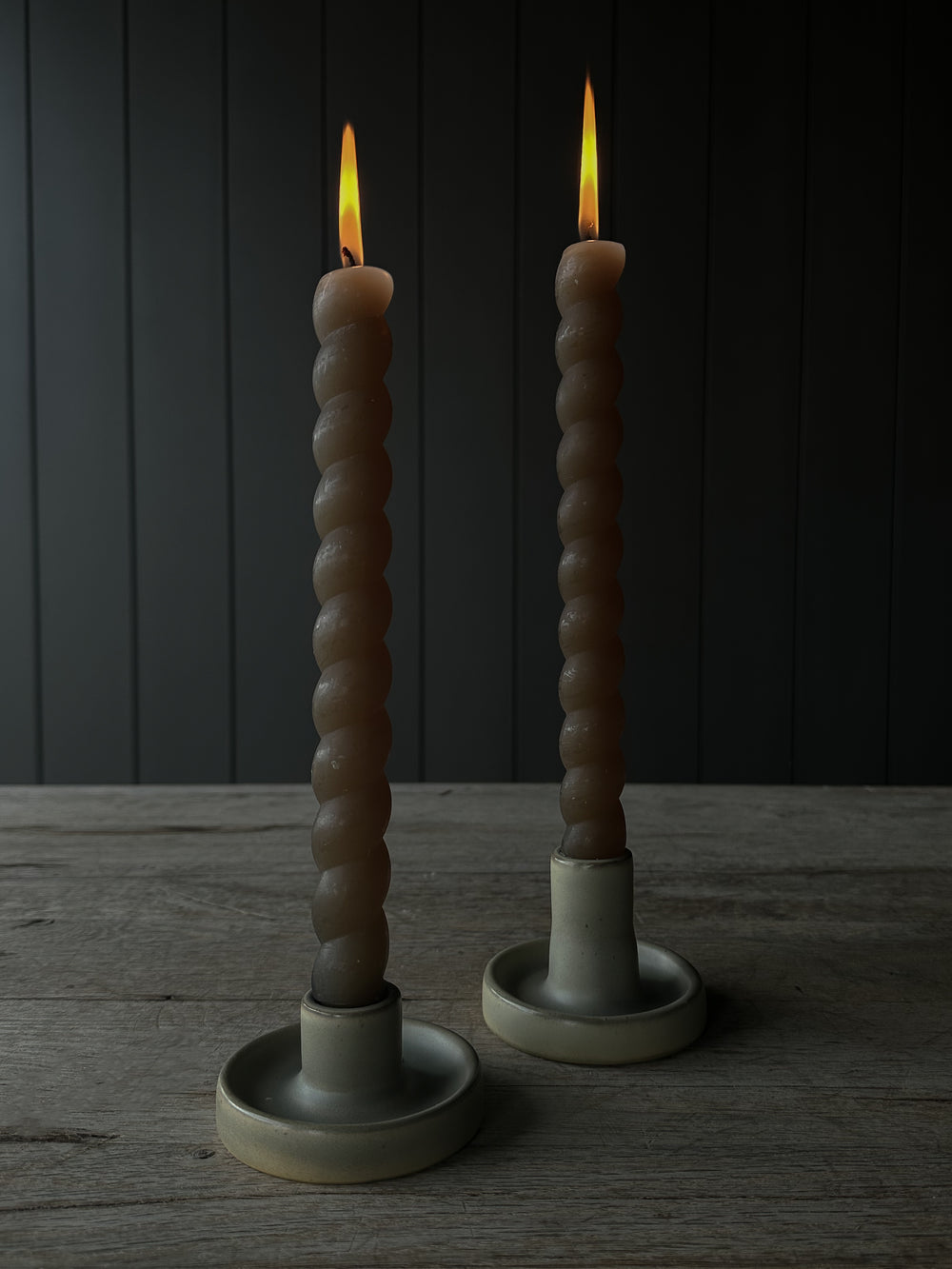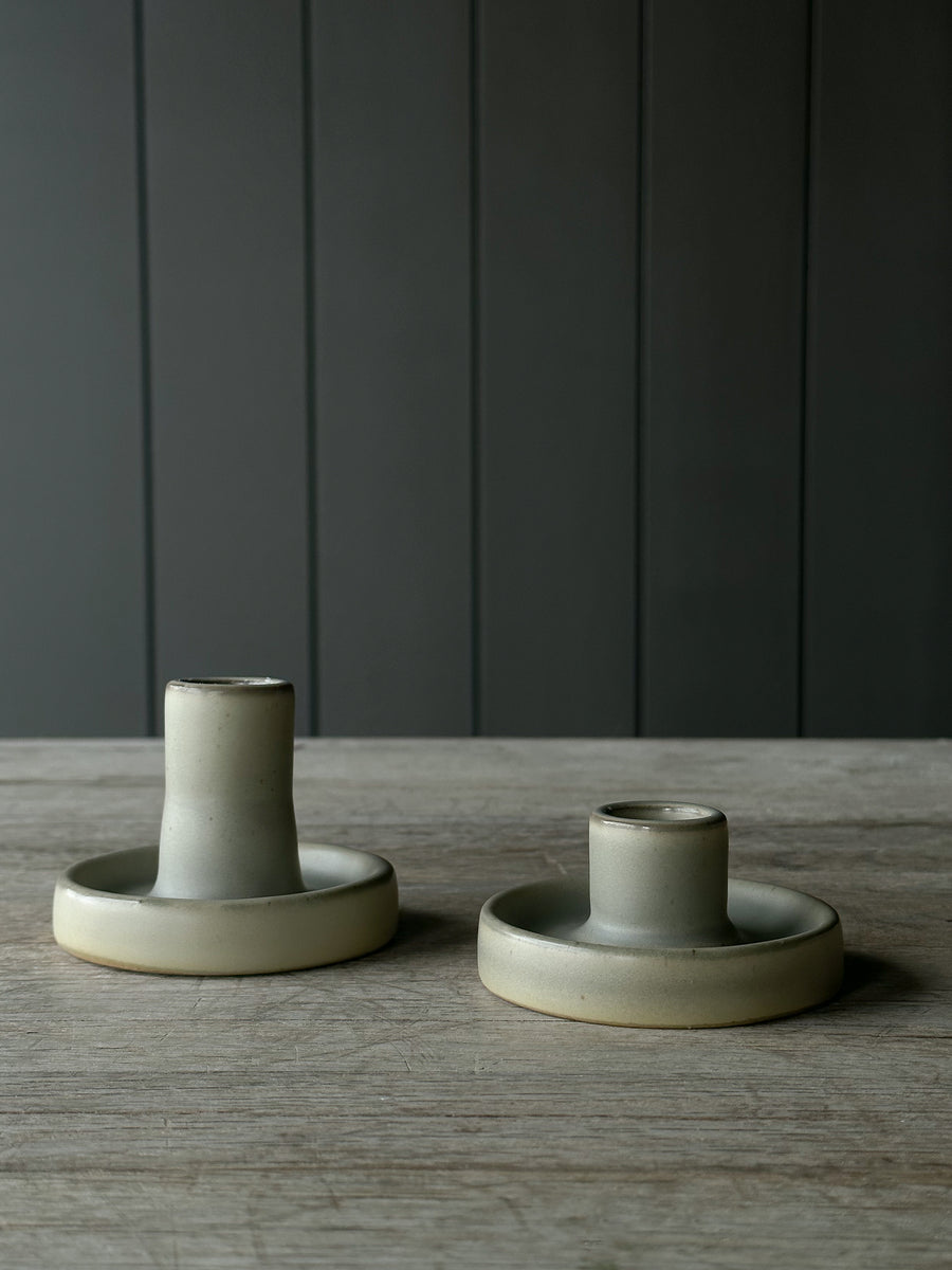 The stylish stoneware taper holders have a lovely cream-colored reactive glaze finish. Pair with your favorite set of tapered candles.