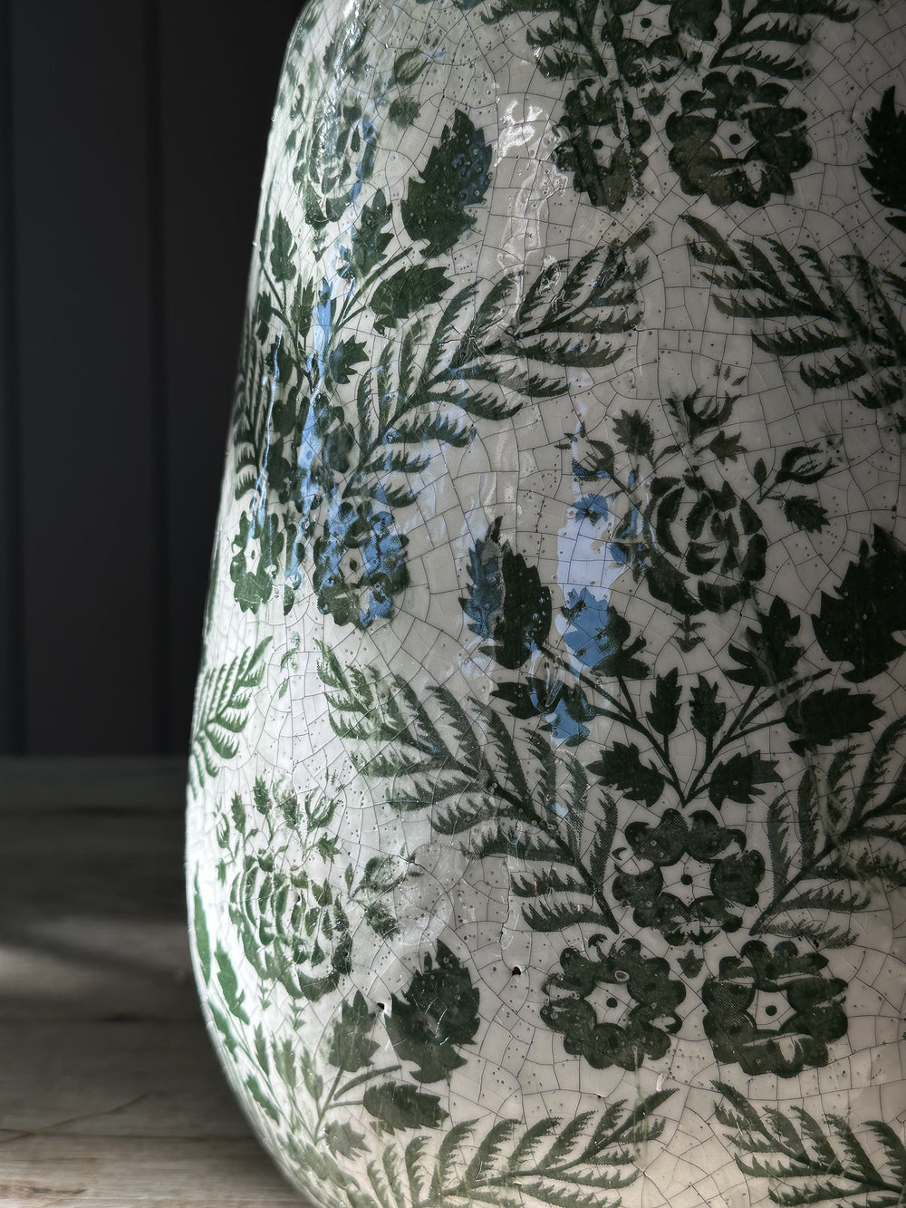 This unique terra-cotta planter/vase features a round shape with a wide opening and a flower pattern, giving it a natural and lovely look. The crackle glaze creates a glossy surface, while the green and white color scheme adds a cozy and elegant touch. This planter/vase can be used to display fresh or artificial flowers, plants, or herbs, or as a decorative accent.