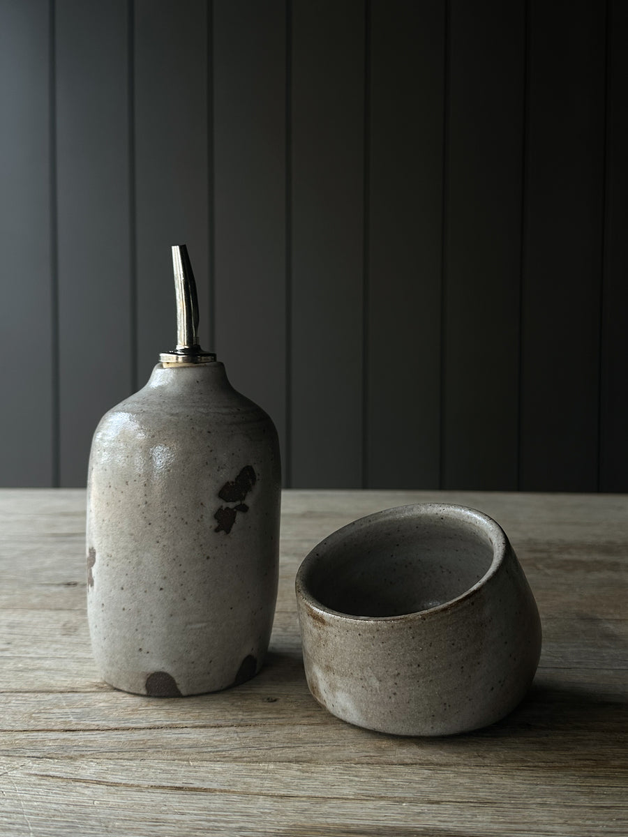 She.Made hand-blended Clove clay give these cruets their deep color and delicate speckle. Each piece features a one-of-a-kind makers mark: Fingerprints near the base where it was held as it was dipped in the glaze. Fill with your favorite oil to add a touch of simple beauty in your everyday cooking routine.