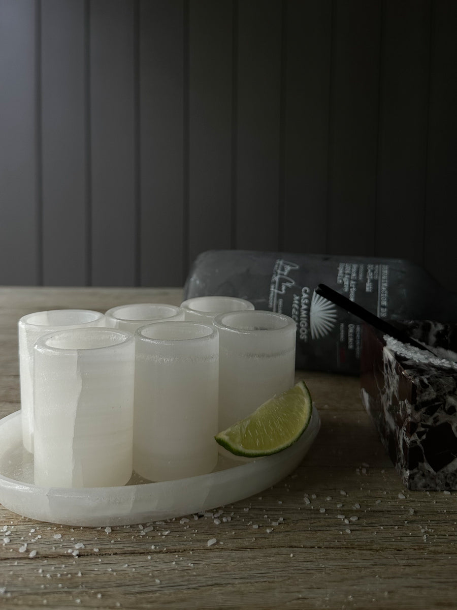 Inspired by the nahua people of puebla tecali de herrera, this is a handmade onyx stone serving tray and six handmade shot glasses.